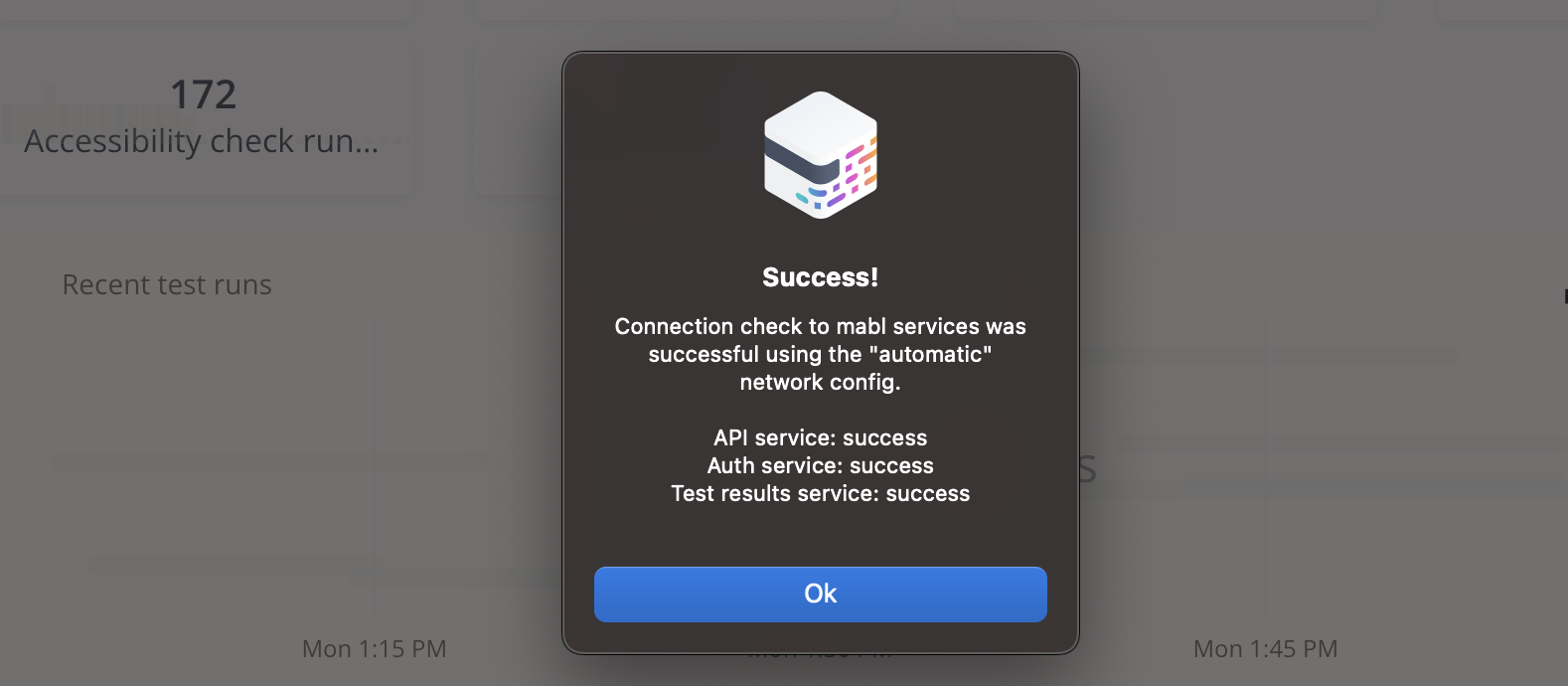 接続の確認に失敗した場合は、会社のプロキシセキュリティを管理する担当者やチームに連絡して、mablデスクトップアプリケーションで[プロキシ設定を構成]するためのオプションを確認してください。mabl CLIを使用する場合は、mabl CLIのプロキシ設定を構成する方法が[こちら]に記載されています。