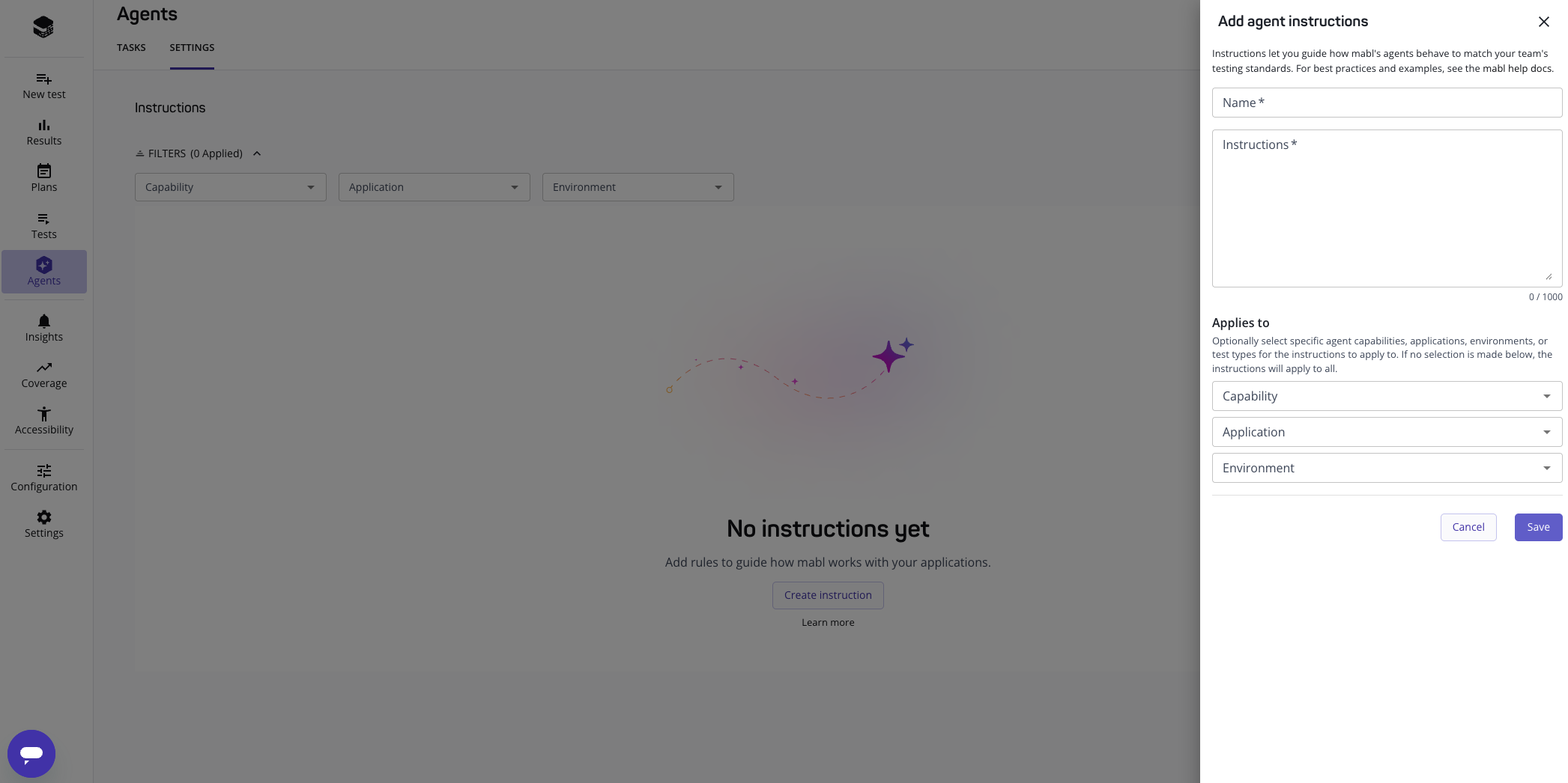 エージェント指示とは、mablエージェントがタスクを実行する方法を定めるユーザー定義のルールです。ビジネスロジック、アプリケーション固有のニュアンス、ガバナンスルールを、エージェントがすべてのタスクに持ち込むコンテキストに組み込むために活用してください。例を以下に示します。